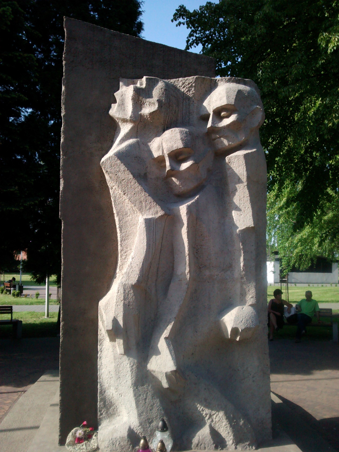 Pomnik został odsłonięty w styczniu 1966 r. Upamiętnia on śmierć 30 tys. więźniów pracujących w zakładach koncernu I.G. Farben – produkującego tu metanol i kauczuk – w latach 1941-45. (31.10. 1942 założono na obrzeżach wsi Monowice podobóz Lager IV, zwany później Auschwitz III Aussenlager, a od listopada 1944r. Konzentrazionslager Monowitz).