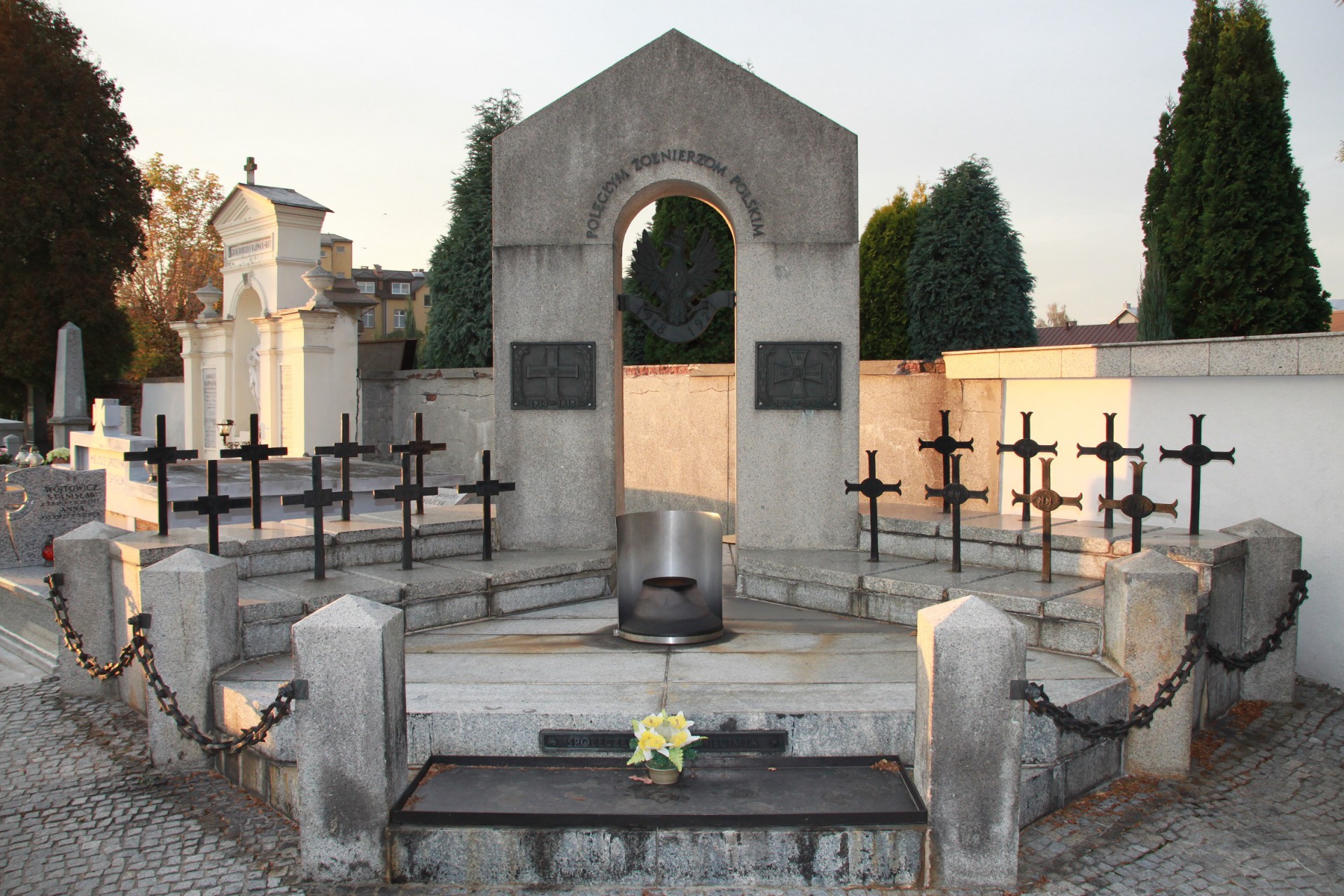 Symboliczny pomnik Nieznanego Żołnierza postawiono w 1925 roku na placu Tadeusza Kościuszki. W 1927 roku przeniesiono tu płytę z pomnika wzniesionego dwa lata wcześniej ku czci żołnierzy poległych podczas I wojny światowej. W czasie II wojny światowej płytę usunięto. W 1945 roku ustawiono ją na Rynku Głównym przy ścianie niemieckiego bunkra, a wizerunek orła pozbawiono korony. 11 listopada 1992 roku uroczyście odsłonięto tu pomnik, od tego czasu nazywanego Grobem Nieznanego Żołnierza. Ułożono też replikę pierwotnej płyty z 1925 roku, u podnóża krzyża wmurowano cztery urny z ziemią przywiezioną z cmentarza Orląt Lwowskich i miejsca zamordowania oficerów w Katyniu oraz pól bitewnych pod Rajskiem i Proszowicami. Odbywają się tu patriotyczne uroczystości.
